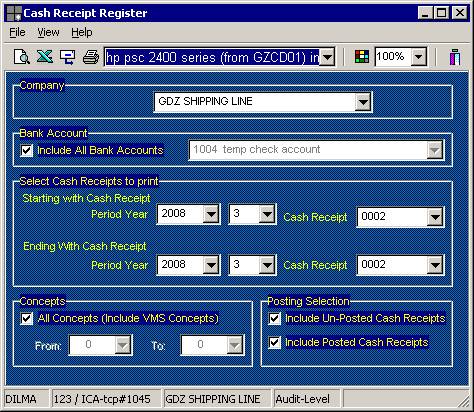 This is a report that shows a list of the cash receipts that have been entered against a specific period of time. It shows posted an/or un-posted items, if so desired, and shows detail information of the receipt, such as company name, invoice number being affected and amount among others.